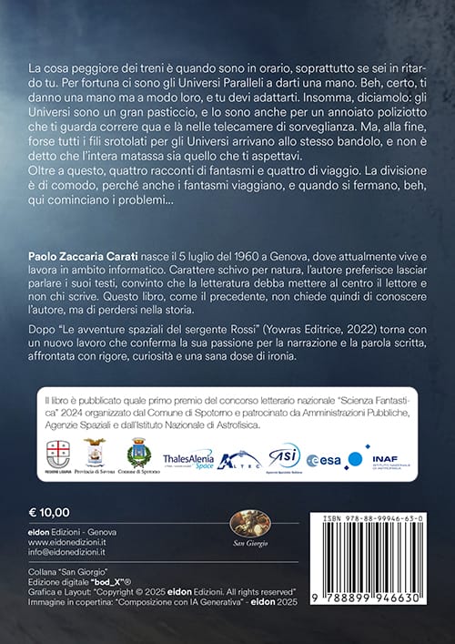La cosa peggiore dei treni è quando sono in orario, soprattutto se sei in ritardo tu. Per fortuna ci sono gli Universi Paralleli a darti una mano. Beh, certo, ti danno una mano ma a modo loro, e tu devi adattarti. Insomma, diciamolo: gli Universi sono un gran pasticcio, e lo sono anche per un annoiato poliziotto che ti guarda correre qua e là nelle telecamere di sorveglianza. Ma, alla fine, forse tutti i fili srotolati per gli Universi arrivano allo stesso bandolo, e non è detto che l’intera matassa sia quello che ti aspettavi. Oltre a questo, quattro racconti di fantasmi e quattro di viaggio. La divisione è di comodo, perché anche i fantasmi viaggiano, e quando si fermano, beh, qui cominciano i problemi...